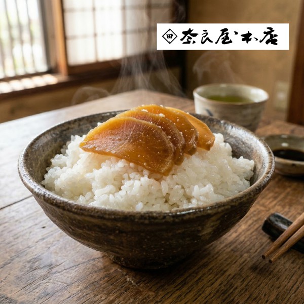 琥珀色に輝く、艶やかな奈良漬。 熱々の炊きたてご飯の上に、ただそれだけ。 奈良屋本店が守り抜いてきたのは、この究極のシンプルさです。