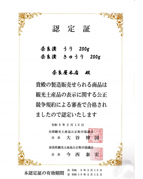 奈良屋本店を代表する2品、奈良漬うりときゅうり(各200g)が、全国観光土産品公正取引協議会および奈良県観光土産品公正取引協議会による審査に合格し、認定を受けました。観光土産品の表示に関する公正競争規約に基づく第三者審査です。